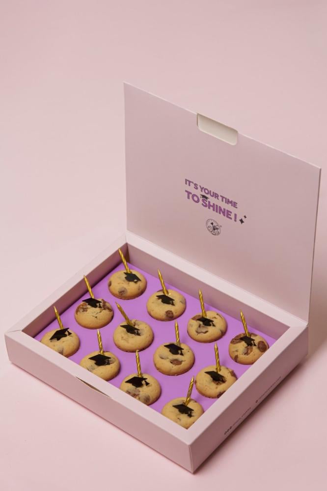 ١٢ قطعة من الكب كوكيز المحشي بالشوكولاتة اللذيذة والغنية مزينة بقبعة التخرج وشمعة ولمعة لإضافة سحرية 🍪🎓